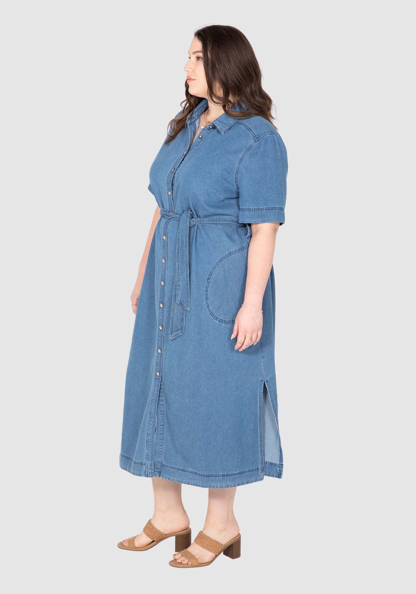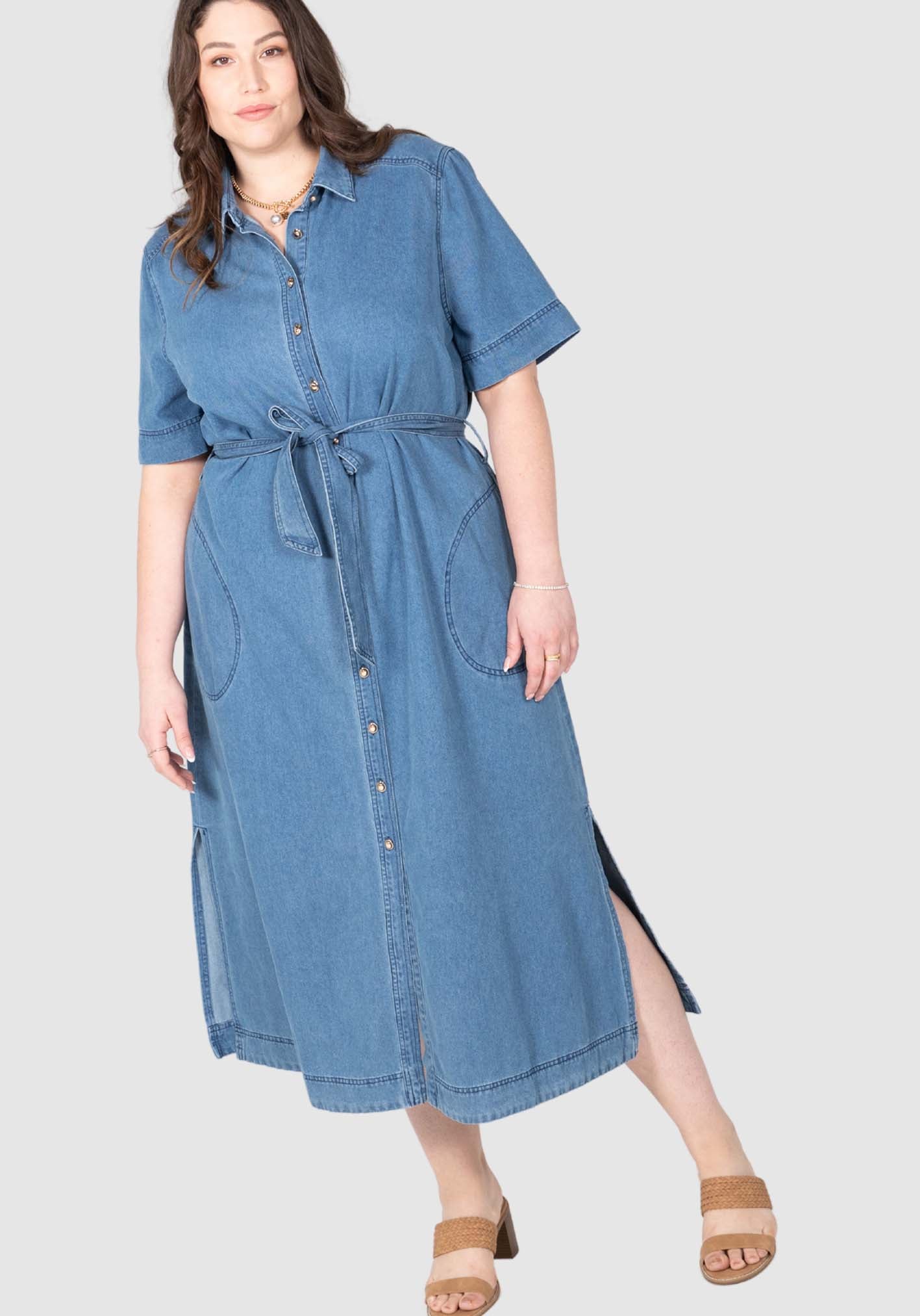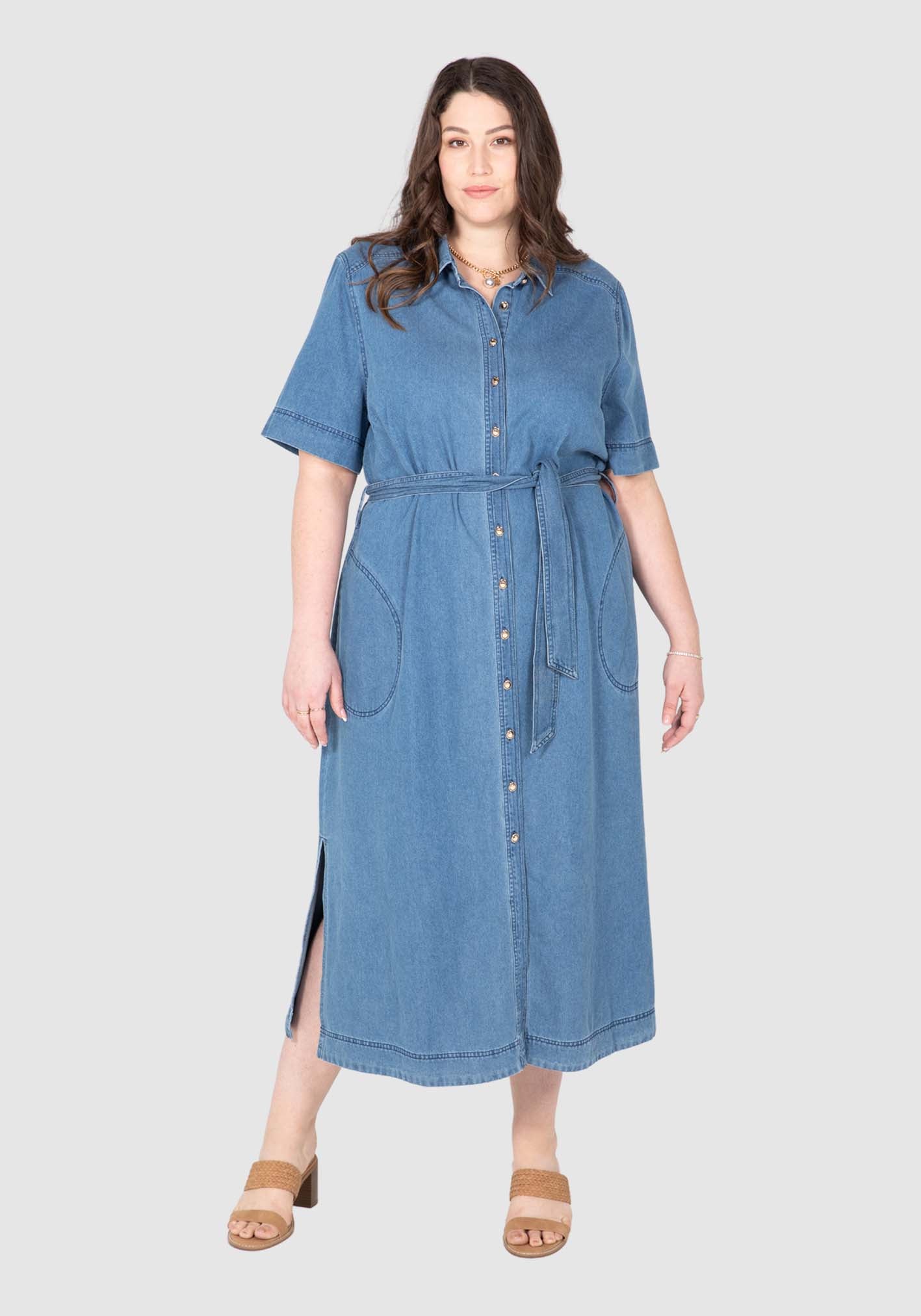 Our Willow Denim Dress masters casual chic. This dress is versatile from workday to weekends with its gold button through front, collar and stand neckline, twin stitching, and removeable tie belt. The 100% cotton denim is washed to a soft liquid hand feel making comfort key.