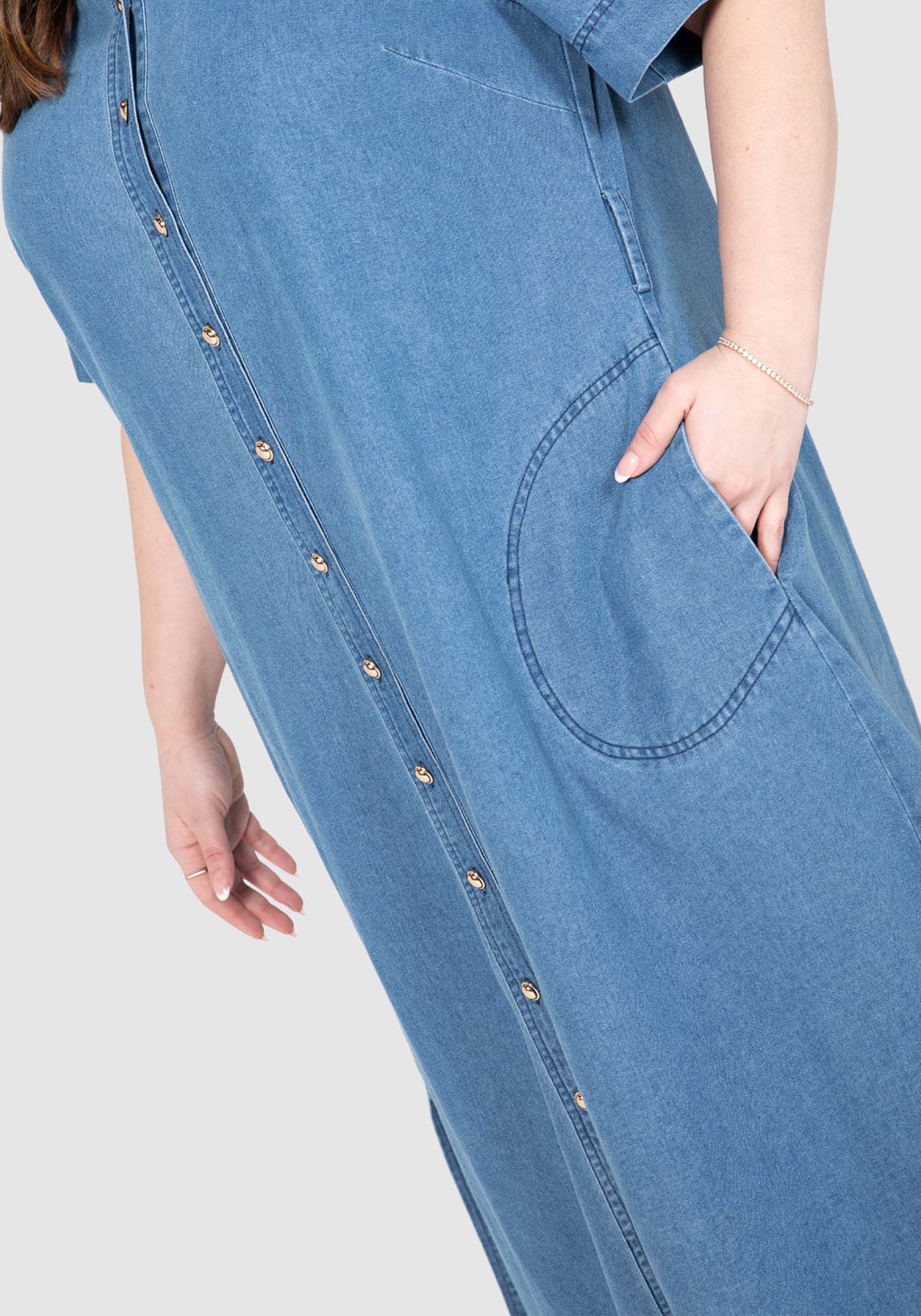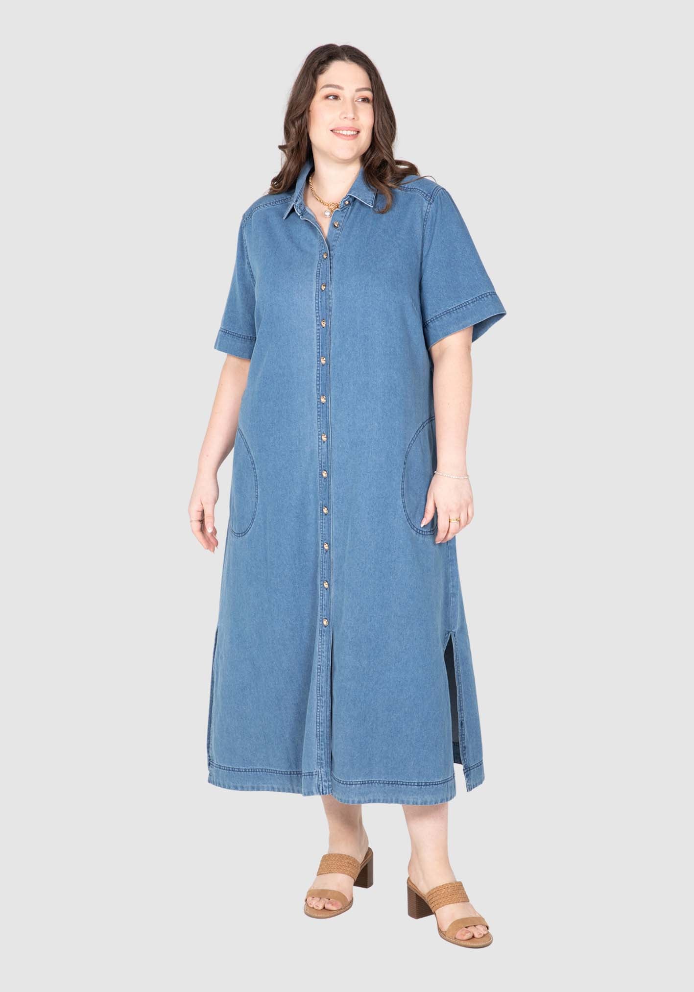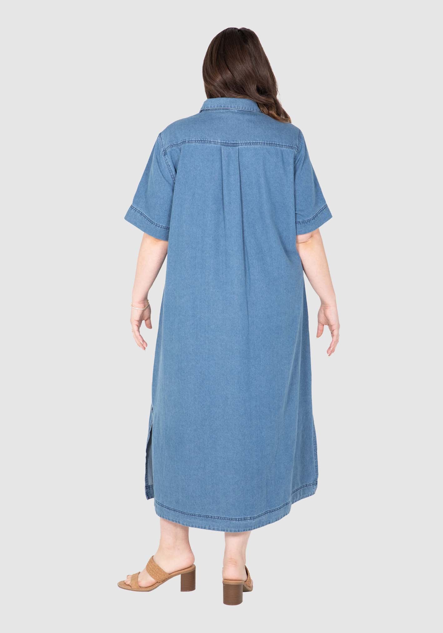 Our Willow Denim Dress masters casual chic. This dress is versatile from workday to weekends with its gold button through front, collar and stand neckline, twin stitching, and removeable tie belt. The 100% cotton denim is washed to a soft liquid hand feel making comfort key.