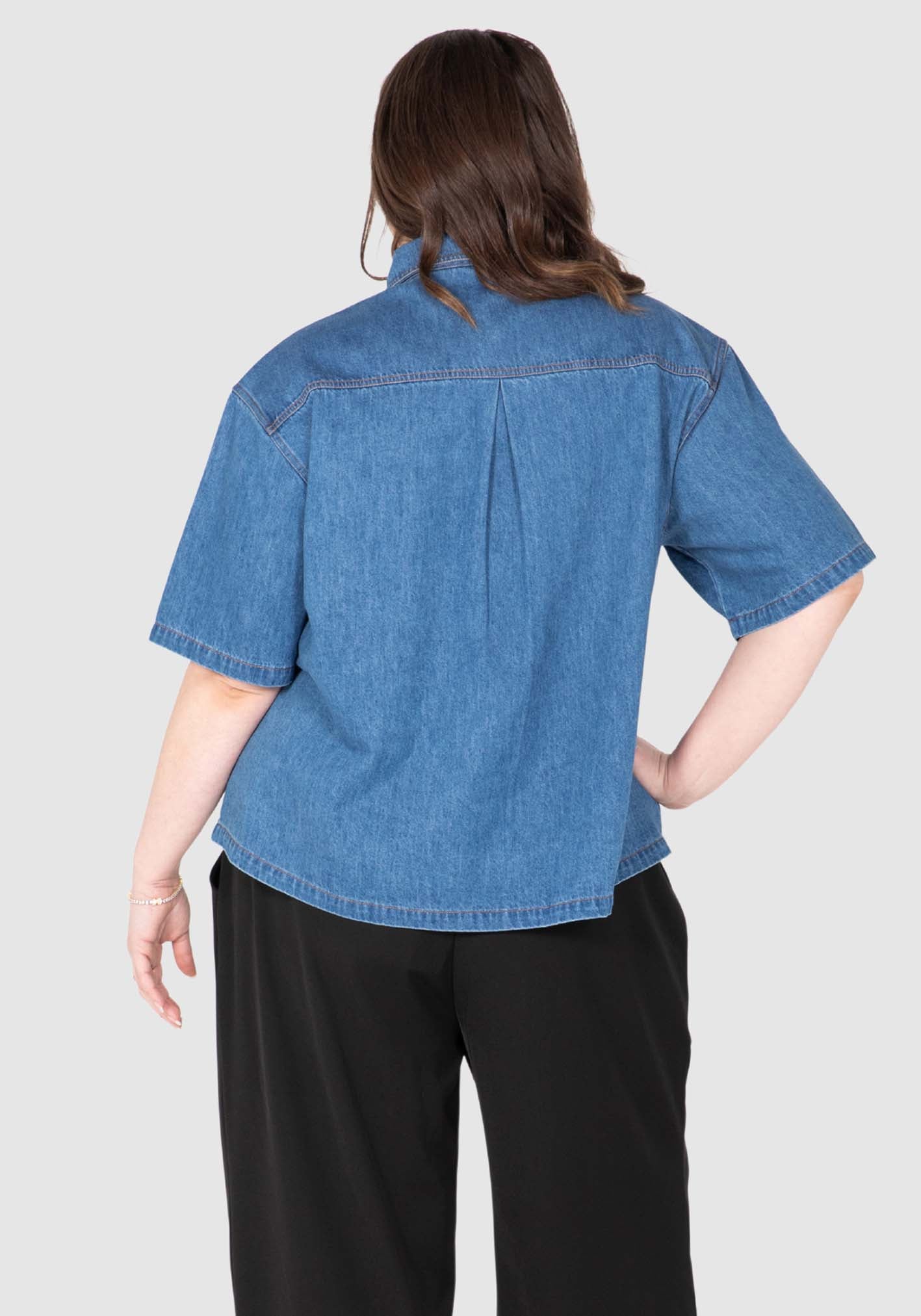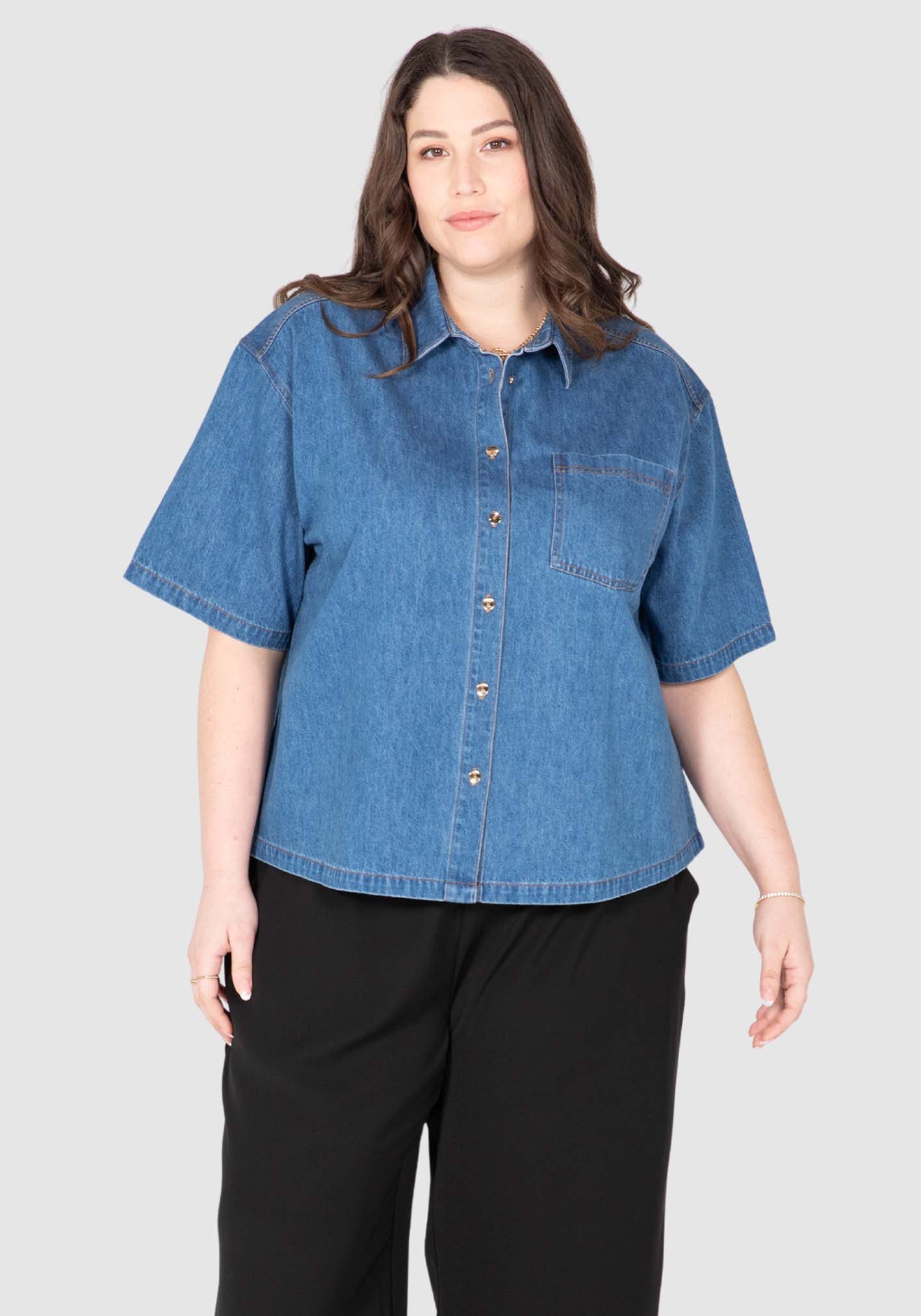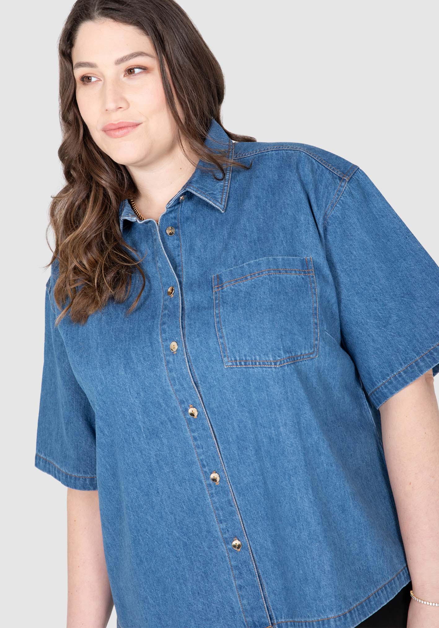 Fresh in denim for the season is our Harper Denim Shirt. This new modern denim must-have style, with its short sleeve shirt silhouette, offers a contemporary box fit complete with collar and gold button through front fastening. A back yoke and tuck for extra movement and a soft liquid wash for comfort.