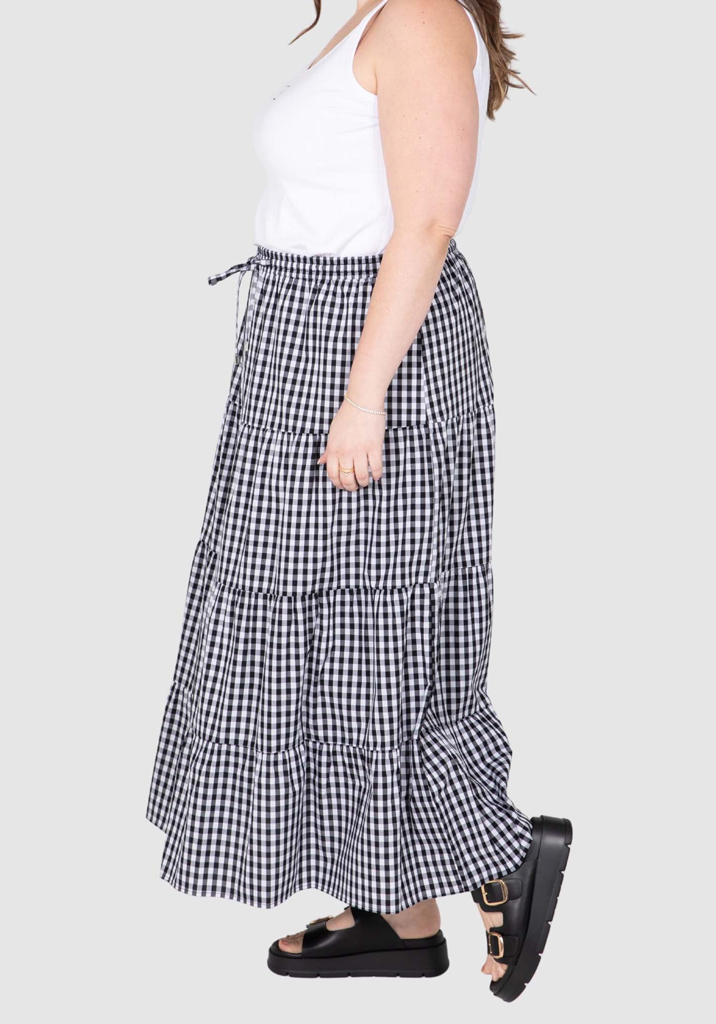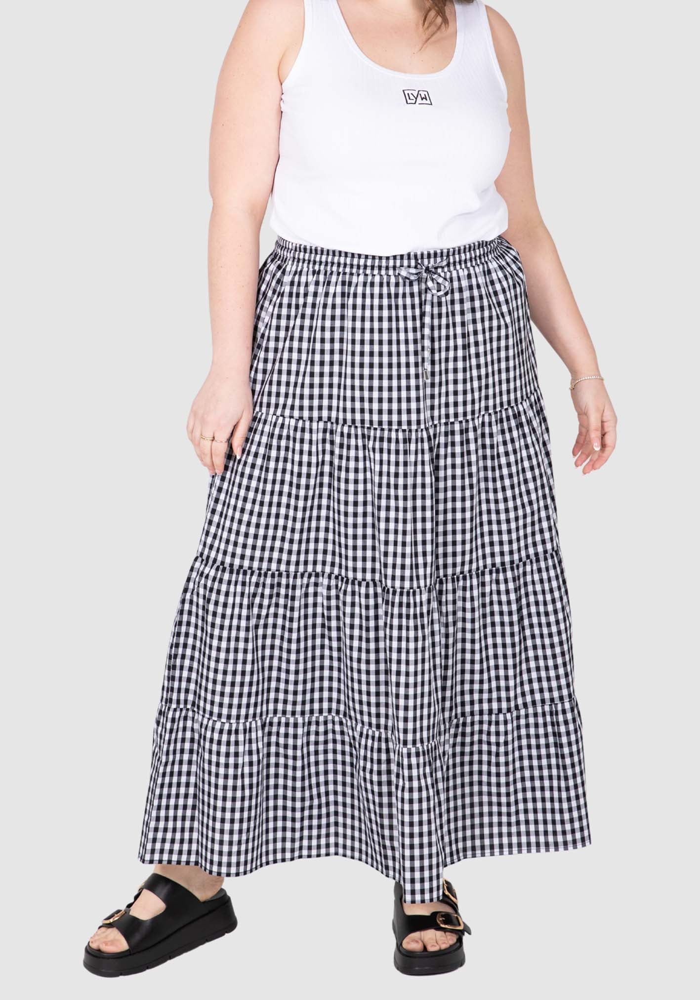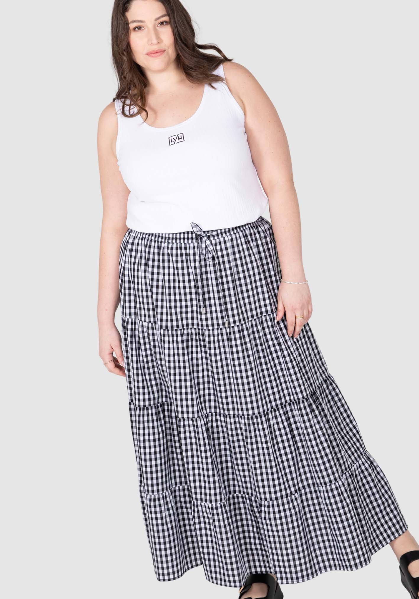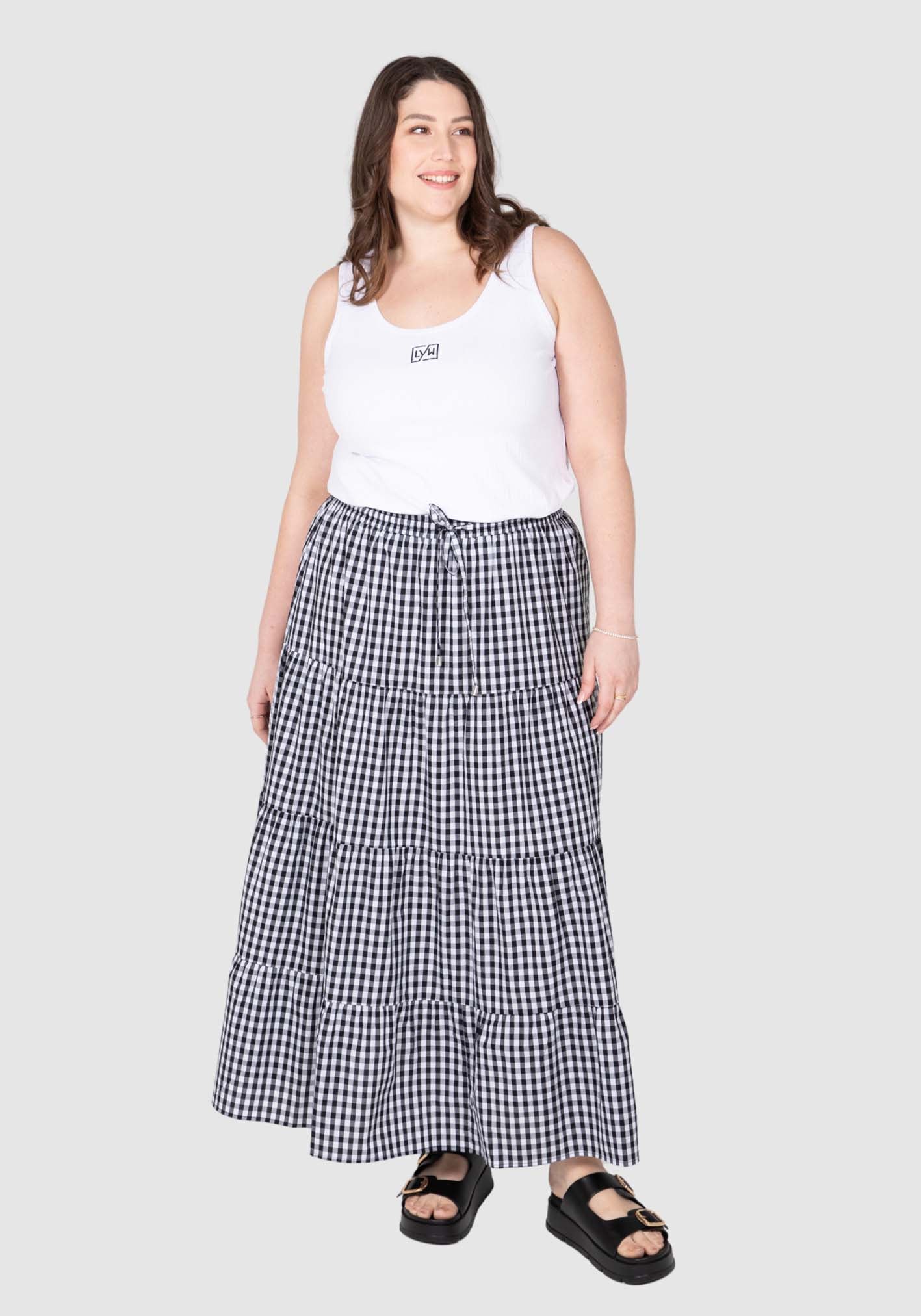 Meet the Stacey Gingham Maxi Skirt. Elevate your wardrobe with this maxi-length skirt, featuring 4 gathered tiers and a pull-on elasticized waist. This versatile design offers lightweight versatility, making it a perfect choice for effortless style. Wear with a tee, our logo tank, or our new Stevie Sleeveless Vest, and team with a chunky sandal.
