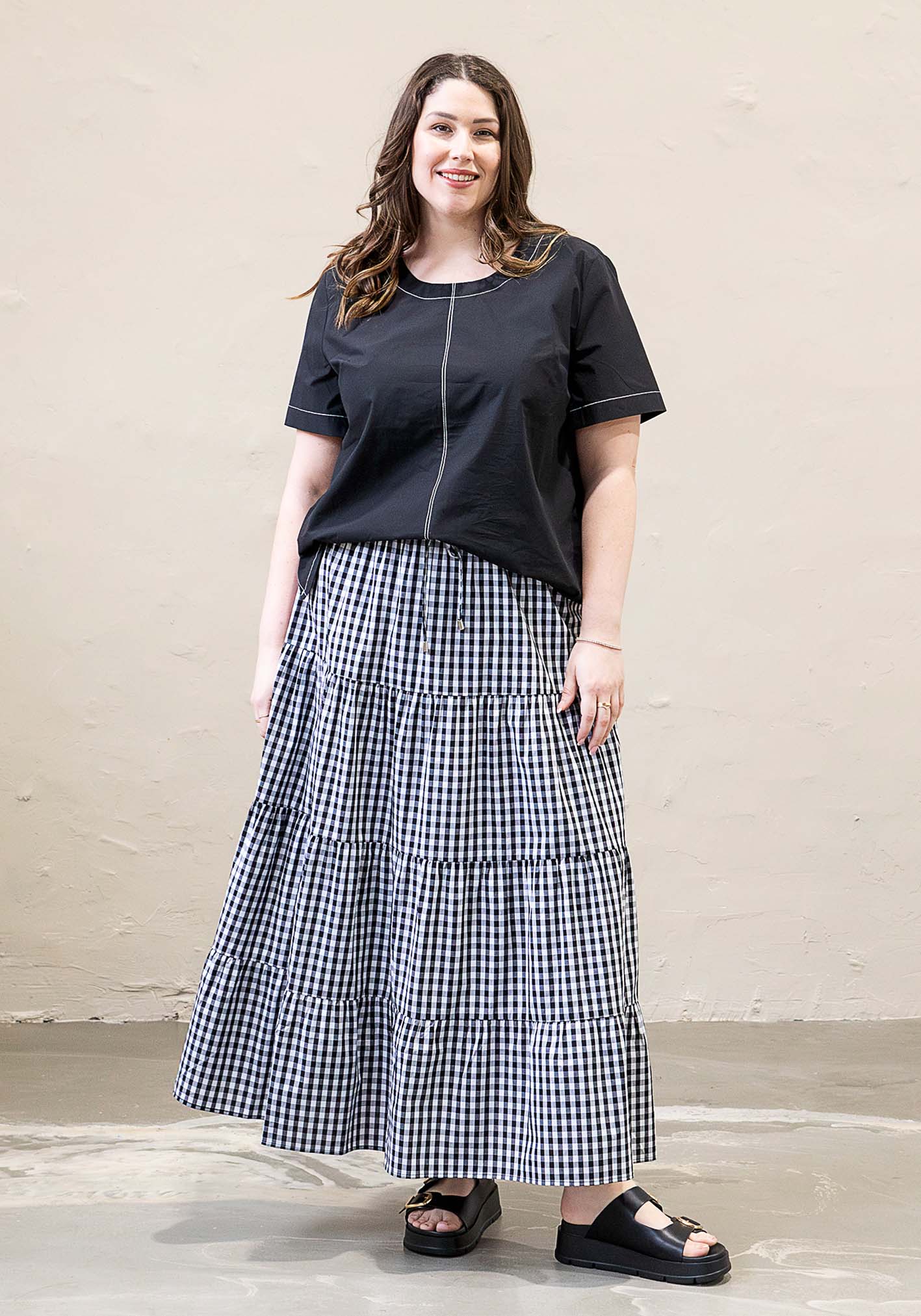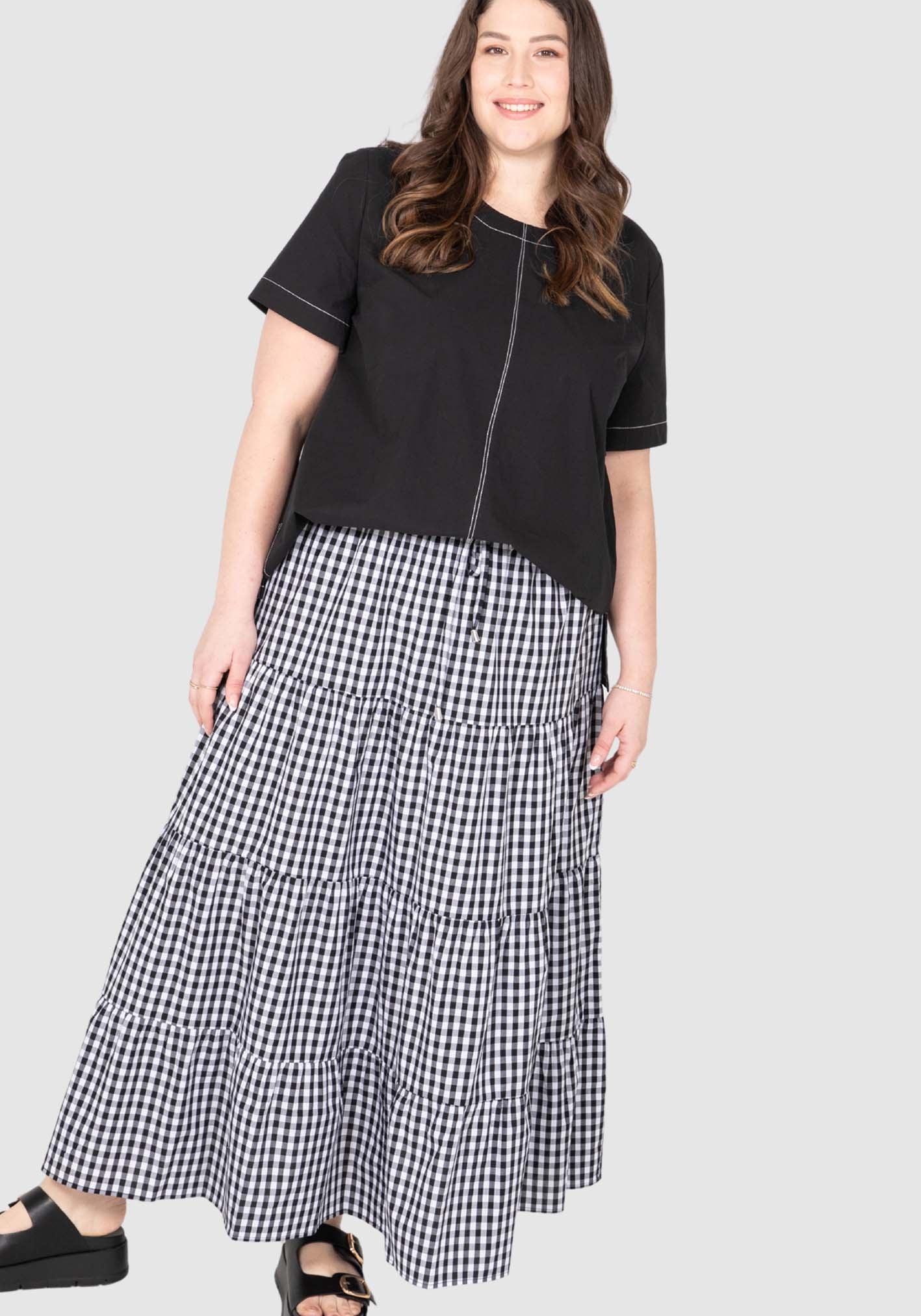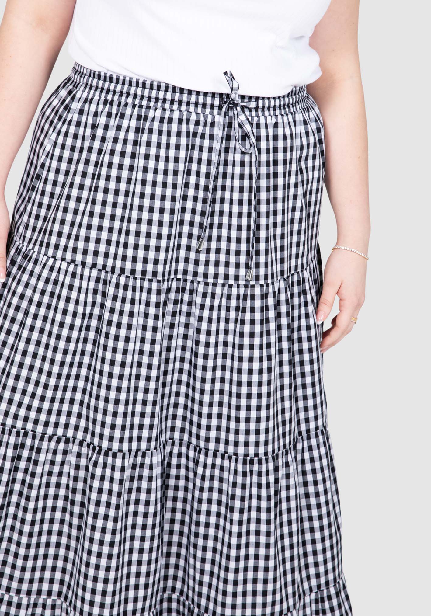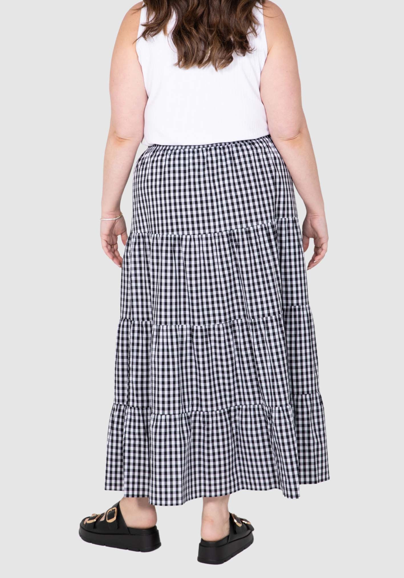Meet the Stacey Gingham Maxi Skirt. Elevate your wardrobe with this maxi-length skirt, featuring 4 gathered tiers and a pull-on elasticized waist. This versatile design offers lightweight versatility, making it a perfect choice for effortless style. Wear with a tee, our logo tank, or our new Stevie Sleeveless Vest, and team with a chunky sandal.